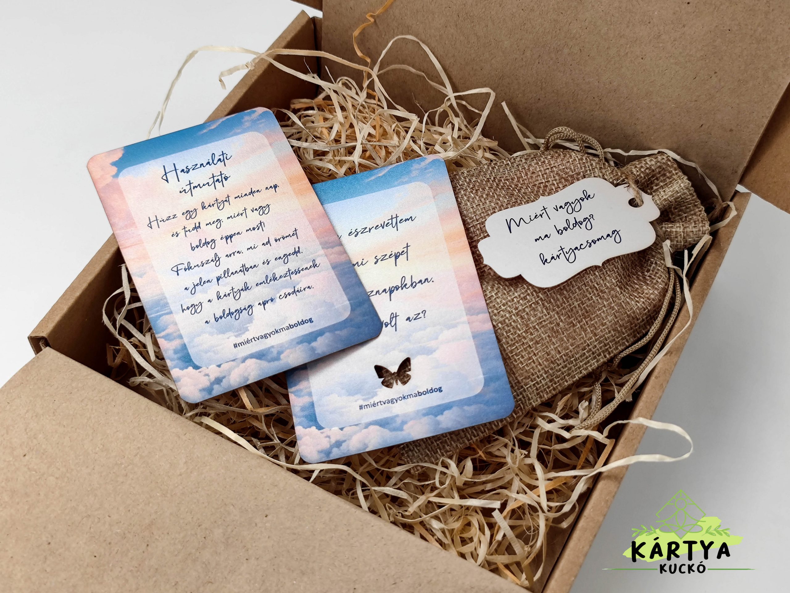 A boldogság ott van körülöttünk – csak néha elfelejtjük észrevenni. A „Miért vagyok ma boldog” kártyacsomag abban segít, hogy újra ráhangolódj az apró örömökre, a hála érzésére és a mindennapi jó pillanatokra.